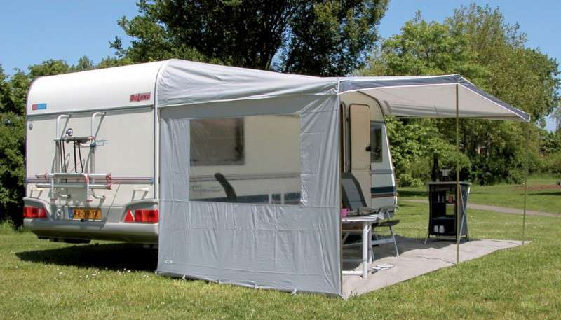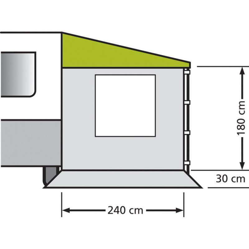 Univerzalna stranska stena za tende z globino 240 cm. Stena je obešena in pritrjena na okvir z nastavljivimi trakovi. Lahko se uporablja univerzalno na desni ali levi strani.