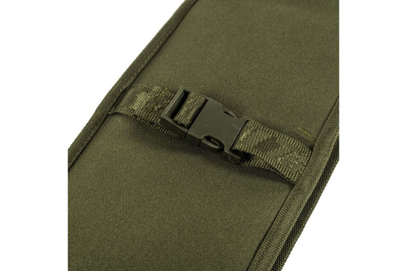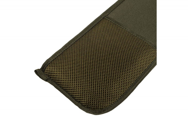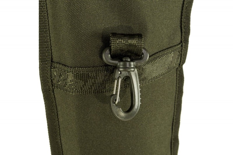 Podložena z zelo gosto peno, ki odlično ščiti palico med transportom. Celotna se zapira z dvosmernimi zadrgami, ki omogočajo hiter dostop do vsebine in dodatno pritrdilno zaponko. Mrežasti žep ustvari prostor za prenašanje manjših pripomočkov ali ribiških dokumentov, kavelj, ki je všit na zunanji strani prevleke - dodatna možnost za pritrditev manjših organizatorjev. Prevleka je izdelana iz temno olivnega materiala z dodatkom kamuflažnega vzorca, kot nalašč za vsakega kraparja, ki ima rad umirjene barve, ki se zlijejo z okolico.